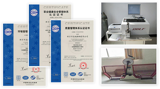 遵循国标2级探伤标准,执行无损探伤检测体系,有德国OBLF公司GS-1000型直读光谱仪,碳硫分析仪,三元素分析仪,机械性能试验机,冲击试验低温槽,冲击试验机,UT、MT探伤设备等。公司于2009年率先在同行业通过ISO9001:2008质量管理体系认证,并于2016年顺利通过环境管理体系认证、职业健康和安全管理体系认证、安全生产标准化认证。