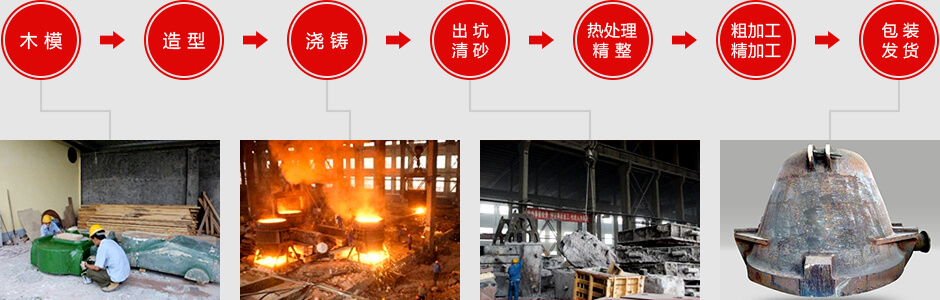 2台30吨、1台75吨碱性电弧炉;7米*12米和5米*7米2台天然气数控热处理炉;大小起重设备22台套;起吊能力200T要比市场上的起吊能力高;公司自建有天然气站、二氧化碳站、空压站配套设施;生产采用水玻璃砂造型工艺;采用华铸CAE铸造模拟软件,缩短试制周期,提高产品质量。